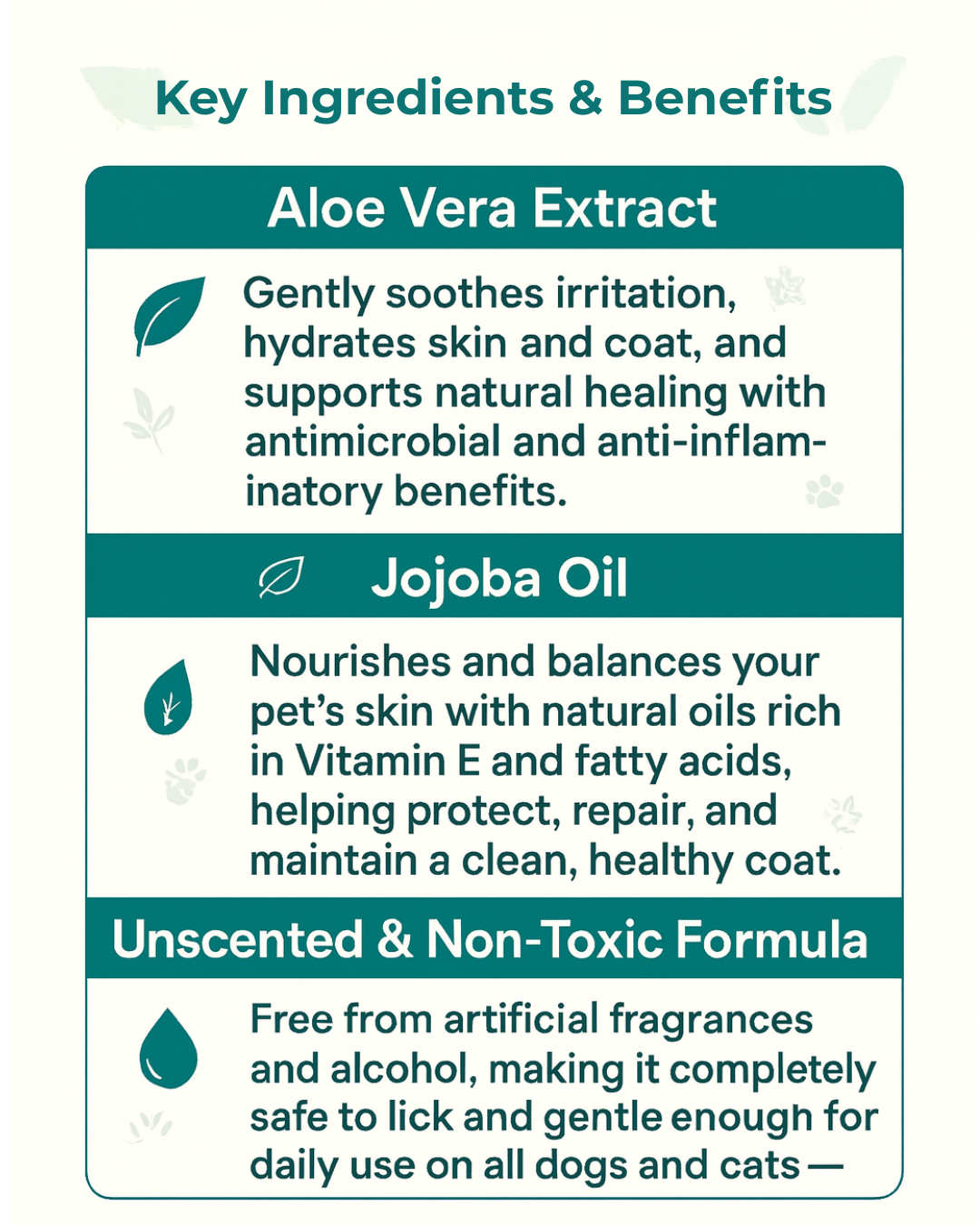 - Aloe Extract – Known for its soothing and moisturizing properties, Aloe helps calm sensitive skin and reduce irritation while leaving your pet’s coat soft and refreshed.